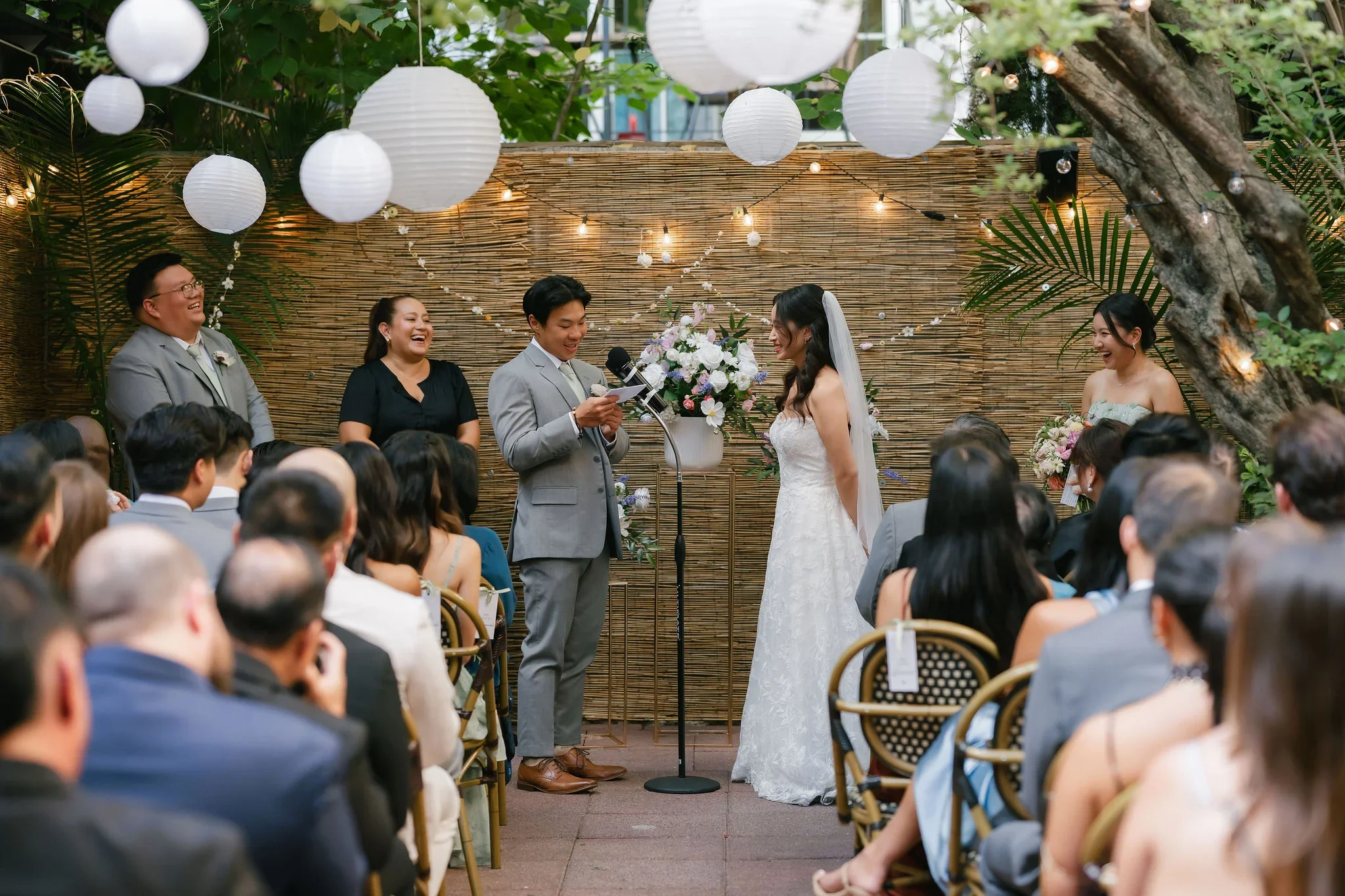 A couple sharing a kiss during their wedding ceremony in an outdoor courtyard with lush greenery and string lights. Guests are seated and watching, some smiling and clapping. A young girl in a suit and a toddler are standing nearby, and a man is taking a photo.